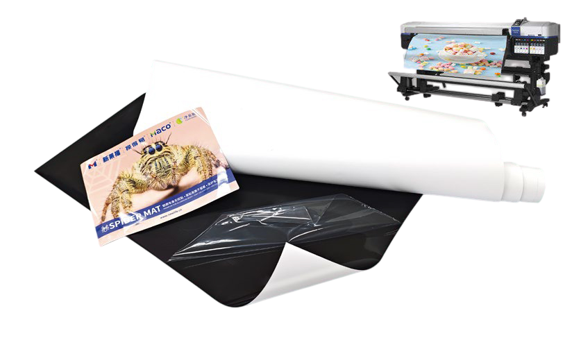 Spider Mat is a material created for printing directly for Counter Top or Point of Sale media without having to laminate multiple substrates together. It is a matte white PET print surface with a magnet receptive core and our micro-suction silicone cling on the back. You print directly on the media and then it will stick to any smooth, non-porous surface just like a suction cup. It is re-useable, repositionable and will not leave any residue behind when you remove it. It can also be applied to glass and magnets will be attracted to your graphic on the glass. It is 0.38mm total thickness. Compatible with Solvent, UV, and Latex printers. It is also safe for stainless steel surfaces.